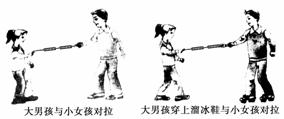 (4)让大男孩穿上溜冰鞋站在水泥地上,小女孩站在草地上对拉,两弹簧秤的示数大小是否相等______.