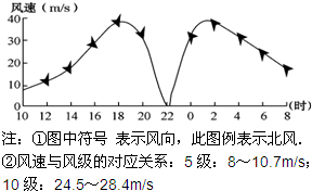 表示风向,此图例表示北风,22时为天气系统过境时,该天气过境前盛行西北风,该天气系统过境后盛行东南风,过境时中心风力为0,由此可以判断该天气系统为北半球气旋.北半球气旋水平方向上气流逆时针由四周流向中心,风向由西北风转变为东南风,由此可以判断该天气系统的移动方向是由东南向西北.