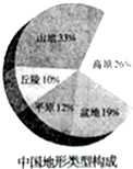 (2)中国陆地五种地形类型中,哪一种地形所占的比例最大?______.