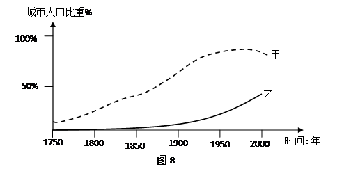 读图8:“发达国家和发展中国家城市化进程差异图”,并结合所学知识,回答下列问题(10分) (1)图中代表发达国家的曲线是 ???? 曲线,你的判断的依据是:该曲线所代表的国家城市化水平 ??????? ,目前出现了明显的 ?????????? 现象。在亚洲国家中属于该类国家的是 ?????????? 。(4分) (2)图中另一条曲线代表的是 ???????? 国家,该类国家城市化起步 ???? 于甲曲线所代表的国家。目前的城市化水平也远 ???????? 于甲类国家。(3分) (3)影响一个国家城市化进程的主要因素是???? 。(1分)二战后,发展中国家城市发展多表现出不合理的现象,试说明“虚假城市化”是如何形成的?(2分) ??????????????????????????? , ??????????????????????????? 。 |