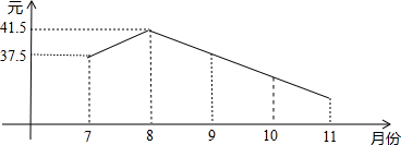 股票有风险,入市须谨慎、我国A股股票市场指数从2007年10月份6100多点跌到2008年10月份2000点以下,小明的爸爸在2008年7月1日买入10手某股票(股票交易的最小单位是一手,一手等于100股),如图,是该股票2008年7-11月的每月1号的收盘价折线图,已知8,9月该股票的月平均跌幅达8.2%,10月跌幅为5.4%,已知股民买卖股票时,国家要收千分之二的股票交易税即成交金额的2‰,下列结论中正确的个数是( ) (1)小明的爸爸若在8月1日收盘时将股票全部抛出,则他所获纯利润是(41.5-37.5)×1000×(1-2‰)元;(2)由题可知:10月1日该股票的收盘价为41.5×(1-8.2%)2元/股;(3)若小明的爸爸的股票一直没有抛出,则由题可知:7月1日-11月1日小明的爸爸炒股票的账面亏损为37.5×1000×(1-2‰)-41.5×1000×(1-8.2%)2×(1-5.4%)元.
