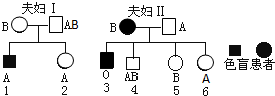 控制ABO血型的IA、IB、i三个等位基因位于常染色体上,色盲基因b位于X染色体上.请分析下面的家谱图,图中有的家长和孩子是色盲,同时也标出了血型情况.在小孩刚刚出生后,这对夫妇因