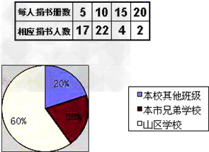 | 某班全体同学在“献爱心”活动中捐了图书,捐书情况如下表:(1)该班的学生共有( )人.(2)全班一共捐书( )册.(3)若该班所捐图书拟按图所示比例分送给山区学校、本市兄弟学校和本校其他年级,则送给本市兄弟学校的书有( )册. |