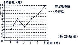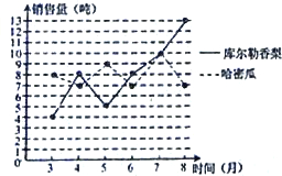 某瓜果销售公司去年3月至8月销售库尔勒香梨,哈密瓜的情况见下表: | 3月 | 4月 | 5月 | 6月 | 7月 | 8月 | | 库尔勒香梨(吨) | 4 | 8 | 5 | 8 | 10 | 13 | | 哈密瓜(吨) | 8 | 7 | 9 | 7 | 10 | 7 | (1)请你根据以上数据填写下表; (2)补全折线统计图;(3)请你根据下面两个要求对这两种瓜果在去年3月份至8月份的销售情况进行分析:①根据平均数和方差分析;②根据折线图上两种瓜果销售量的趋势分析. |