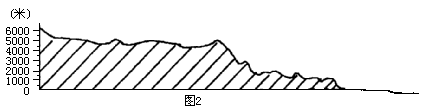 | 旅游爱好者王晓明在旅行日记中绘制了祖国轮廓图(如图1)和地形剖面图(如图2)。读图,完成下题。