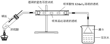 | 利用下图进行浓硫酸与铜反应,并验证二氧化硫的性质。 实验操作如下:连接仪器和安放药品,用酒精灯加热1分钟后撤去酒精灯,将铜丝伸入液面以下,一段时间后拉起铜丝。 请回答下列问题: (1)将反应后的试管充分静置,观察到试管底部有白色固体出现,中间层是浅黄色液体(浓硫酸),上层是蓝色溶液。白色固体的化学式为 ????????????? ,上述现象中体现了浓硫酸的性质有 ?????????????? (填序号) ①酸性????②强氧化性????③吸水性??④脱水性 (2)直玻璃管中依次观察到的现象是:??????????????? ; ?????????????? ;????????? 。 (3)某次实验中小烧杯中澄清石灰水始终未观察到浑浊,你猜想可能的原因是????? ,请设计实验证明它???? 。 (4)某学生发现,常温下将铜片长时间放入浓硫酸的试管中并密封,最终生成黑色物质(Cu 2 S)和蓝色溶液,无气体生成,写出此条件下铜片与浓硫酸反应的化学方程式:? 。 |