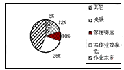 | 某中学对200名学生进行了关于“造成学生睡眠少的原因”的抽样调查,将调查结果制成扇形统计图,由图中的信息可知认为“造成学生睡眠少的主要原因是作业太多”的人数有( )名。 |