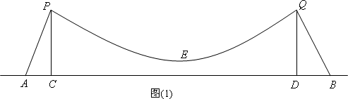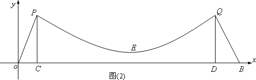 如图(2),以A点为原点,桥面AB所在直线为x轴,过A点且垂直与AB的直线为y轴,建立直角坐标系,则A(0,0),C(200,0),P( ),E( ),D(2200,0),Q( ),B(2450,0).请你先把上面没有写全的坐标补全,然后在王小明同学已建立的直角坐标系下完整地解决本题.