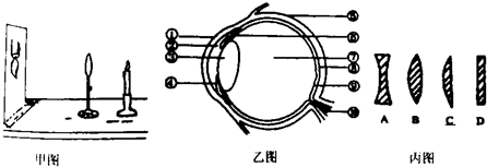 如图分别是《模拟眼球成像的实验》操作示意图(甲图)、眼球的基本结构图(乙图)和多种透镜示意图(丙图),请观察思考后回答44-48题: