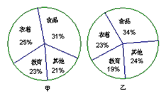 | 如图是甲、乙两户居民家庭全年支出费用的扇形统计图,根据统计图,下面对全年教育费用判断正确的是( ) |