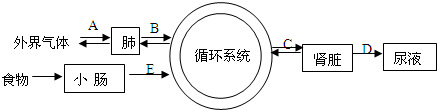 如图是人体新陈代谢的部分示意图,请据图回答:(1)空气中有害气体首先经过A过程进入肺,然后再B过程中通过(原理)进入血液.与人吸入的气体相比,人呼出的气体中减少,