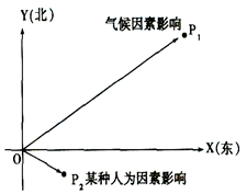 土地覆盖是植被、土壤、河湖、沼泽及各种建筑物等地表诸要素的综合体。图中0点为l980年中国土地覆盖重心,它相对于中国大地坐标原点(109°E,34°N)向正西偏531km,向正北偏448km。P1,