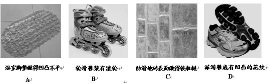 | A、浴室脚垫做得凹凸不平,是在压力一定时,增大接触面的粗糙程度来增大摩擦力,防止滑倒.不符合题意. B、轮滑鞋装有滚轮,是用滚动代替滑动,减小摩擦力.符合题意. C、旅游鞋底有凹凸的花纹,是在压力一定时,增大接触面的粗糙程度来增大摩擦力,防止打滑.不符合题意. D、防滑地砖表面做的较粗糙,是在压力一定时,增大接触面的粗糙程度来增大摩擦力,防止滑倒.不符合题意. 故选D. |