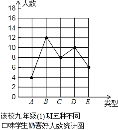 为了贯彻落实国家关于增强青少年体质的计划,重庆市全面实施了义务教育学段中小学学生“饮用奶计划”的营养工程.某牛奶供应商拟提供A(原味)、B(草莓味)、C(核桃味)、D(菠萝味)、E(香橙味)等五种口味的学生奶供学生选择(所有学生奶盒形状、大小相同),为了了解对学生奶口味的喜好情况,某初级中学九年级(1)班张老师对全班同学进行了调查统计,制成了如下两幅不完整的统计图: (1)该班五种口味的学生奶喜好人数组成一组统计数据,直接写出这组数据的平均数,并将折线统计图补充完整;(2)在进行调查统计的第二天,张老师为班上每位同学发放一盒学生奶,喜好B味的小明和喜好C味的小刚等四位同学最后领取,剩余的学生奶放在同一纸箱里,分别有B味2盒,C味和D味各1盒,张老师从该纸箱里随机取出两盒学生奶.请你用列表法或画树状图的方法,求出这两盒牛奶恰好同时是小明和小刚喜好的学生奶的概率. |