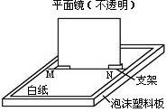 为了探究平面镜成镜时,像到平面镜的距离v与物到平面镜的距离u的关系,现将泡沫塑料板放在水平桌面上,再将白纸平放并固定在泡沫塑料板上,在白纸中间测一条直线MN,把一块带支架的