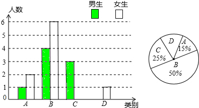 最佳答案: (1)(1+2)÷15%=20人;(2)C组人数为:20×25%=5人,所以,女生人数为5-3=2人,D组人数为:20×(1-15%-50%-25%)=20×10%=2人,所以,男生人数为2-1=1人,补全统计图如图:(3)男生共9人,中位数为第5人的调查情况,故为B,众数为B;女生共11人,中位数为第6人的调查情况,故为B,众数为B;![]() |
