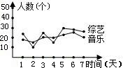 文娱委员随机调查班级里7天内,每天收听综艺或音乐节目的人数,制成折线统计图.如图,判断收听人数比较稳定的是______节目.![]() |