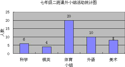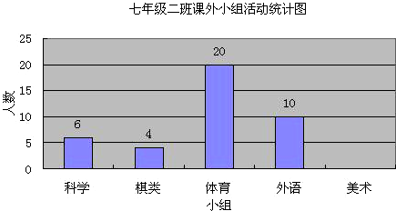 小明对七年级(2)班的同学参加课外兴趣小组的情况进行调查,知道全班58人都分别参加了科学、棋类、体育、外语、美术ck小组活动,通过统计后画出了下面的条形统计图.(1)请你看