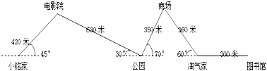 最佳答案: (1)电影院在小铭家东偏北45°的方向上,距离小铭家420米;(2)电影院在公园西偏北30°的方向上,距离公园630米;(3)商场在公园东偏北70°的方向上,距离公园350米;(4)商场在淘气家西偏北60°的方向上,...