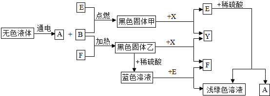 最佳答案: (1)无色液体通电生成A和B,且金属E能跟B在点燃的条件下生成金属氧化物,所以B为氧气,A为氢气,黑色固体乙与硫酸反应生成蓝色溶液,所以乙为氧化铜,且E与蓝色溶液反应生成浅绿色溶液,所以E为铁,而F为铜,因此黑色固体甲为四氧化三铁,乙为氧化铜,E铁和硫酸反应生成硫酸亚铁和氢气,又因X为无色气体,且能还原金属氧化物,生成物还是气体,所以X为一氧化碳,所以通过分析可知,B的化学式O2,Y的化学式为CO2,浅绿色溶液中含有的溶质是FeSO4;