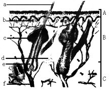 下图为皮肤结构模式图,据图回答相关问题。(1)写出各部分结构的名称:A;B;C;a;b;c;d;e;f。(2)图中能进行分泌和排泄活