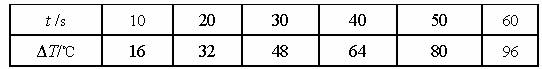 小宇同学用电加热器给质量一定的蓖麻油液体均匀加热,研究液体升高的温度与加热时间的关系。通过测量得到如下表所示的实验数据,请根据表中数据归纳出升高的温度ΔT与加热时间t的关