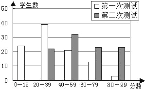 | 有100名学生参加两次科技知识测试,条形图显示两次测试的分数分布情况(如图). 请你根据条形图提供的信息,回答下列问题(把答案填在题中横 线上)(1)两次测试最低分在第______次测试中; (2)第______次测试较容易. |
