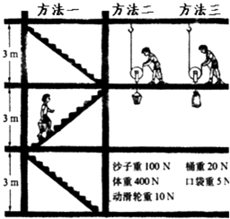 要把重100N的沙子运上三楼,小昕采用了如图中的第一种方法,1min完成了任务.若不计摩擦,试求:(1)运沙子时的机械效率;(2)小昕运沙的功率.