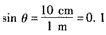 | 一位同学乘坐火车时,想测定某一瞬时火车的加速度,他想了如下办法:用一根1m长的细线,一端固定于火车的顶端,另一端拴一小球。当火车静止时,他记下小球相对于火车的位置O点,如图所示。当火车启动的某一瞬时,小球相对于火车向后摆起,他测得小球偏移O点的水平距离为10 cm。试根据以上所得的数据,计算火车的加速度大小。 |