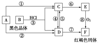 已知A为常见的金属单质,根据如图所示的转化关系回答下列问题。(1)确定A、B、C、D、E、F的化学式:A为,B为,C为。D为,E为,F为。(2)写出⑧的化