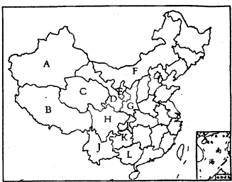 最佳答案: 认真读图可知,A新疆、B西藏、C青海、D甘肃、E宁夏、F内蒙古、G陕西、H四川、I重庆、J云南、K贵州、L广西.根据题意.